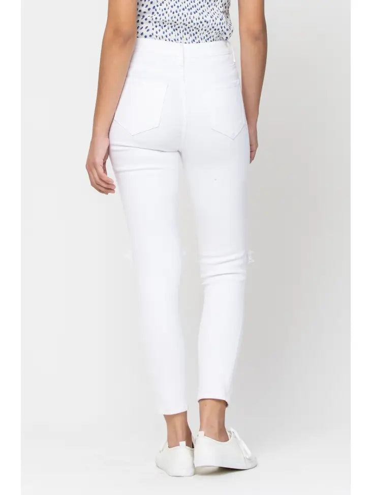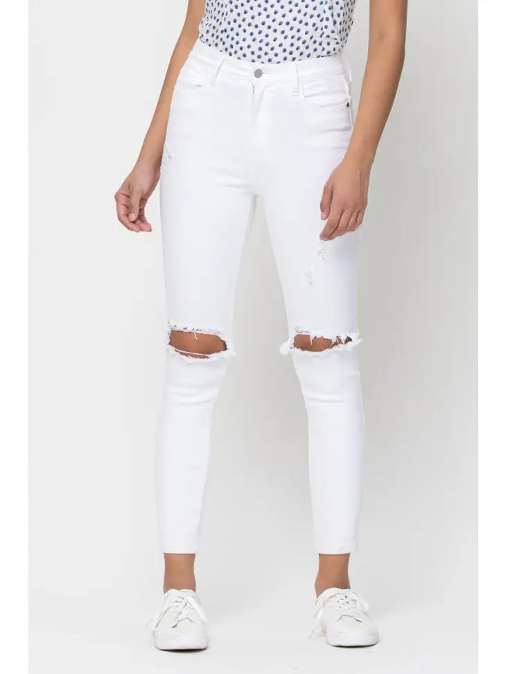 Lean and legs-for-days sexy, our skinny jeans are made of the best-of-the-best white denim and artfully ripped at the knees. Additionally equipped with five pockets, belt loops and a zip fly closure.
