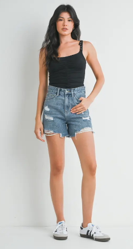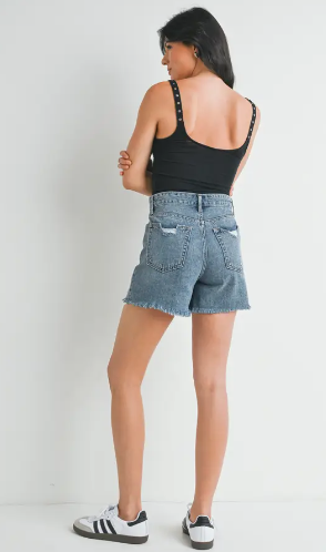 These Distressed Rigid Walking Shorts feature a 12" rise and a 4.5" inseam, designed for comfortable mobility. Crafted from medium denim with a distressed finish, they offer a rugged yet stylish look. The 11.5" leg opening ensures ease of movement, making them ideal for active wear while maintaining a classic denim appeal.