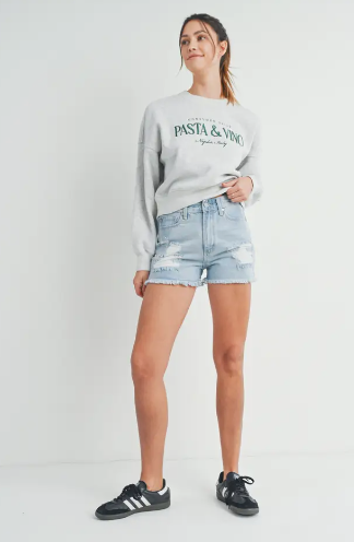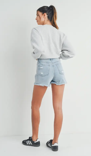 These high-rise destroyed shorts feature an 11" rise and a 2.5" inseam, offering a flattering fit with a modern silhouette. Crafted from light denim, they showcase a frayed hem and distressed detailing for an effortlessly edgy look. The 11.5" leg opening ensures comfortable movement while maintaining a stylish shape. Perfect for casual wear, these shorts combine trend-forward design with expert tailoring.