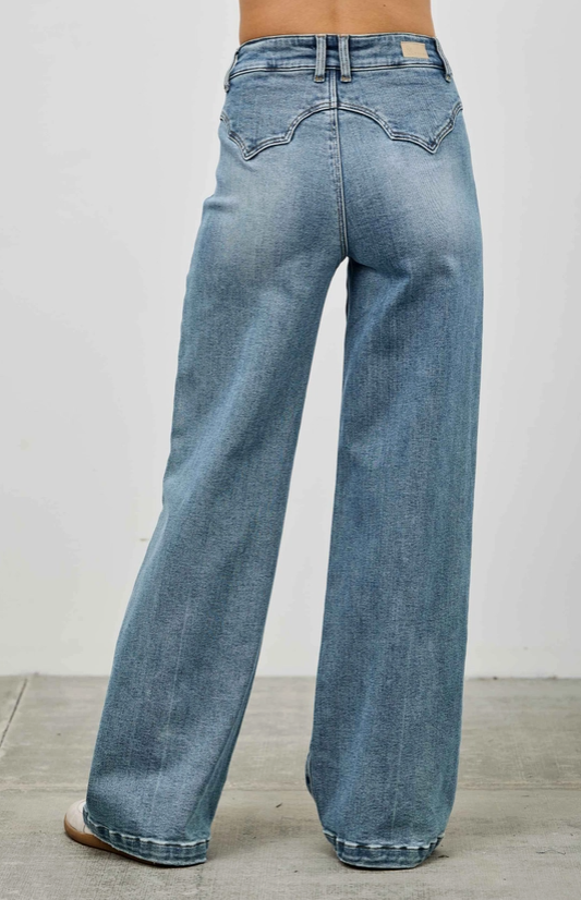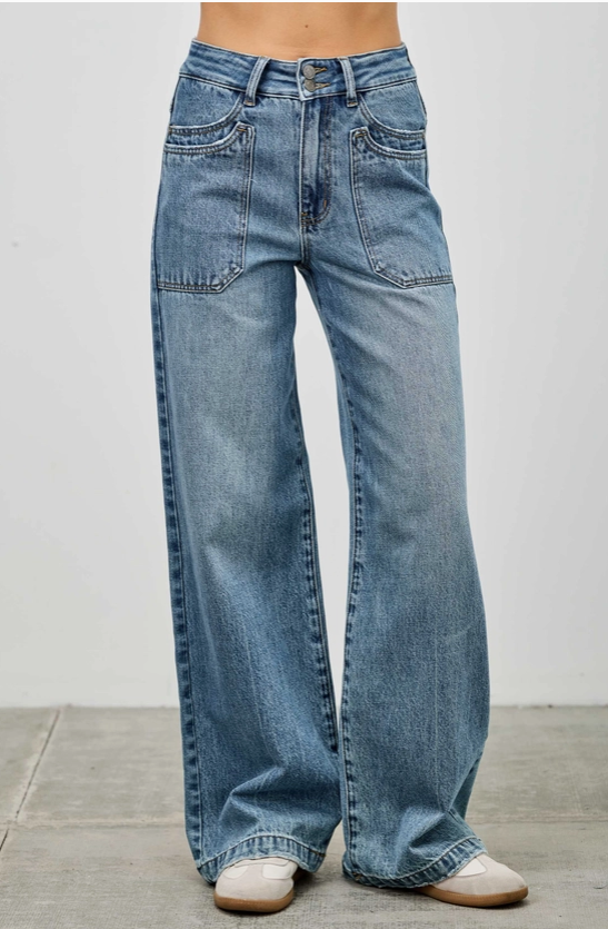 These high-rise wide-leg pants feature a secure zipper fly and a practical patched front pocket, combining elevated design with everyday functionality. The double-pocket detail enhances convenience without compromising the streamlined silhouette, making them an expert choice for versatile, fashion-forward dressing.