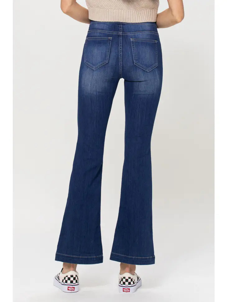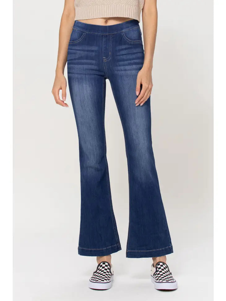 Get comfortable and trendy in these ultra-stretchy jeans. The dark wash flared jegging features a flattering flared fit, a faded wash, and light whisker detail. Additionally it has two faux front pockets and two back real pockets.