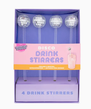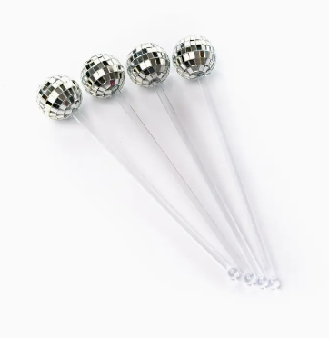 t’s time to boogie down and mix up some groovy cocktails. Our Disco Drink Stirrers are the perfect accessory for all your glam disco parties. Sip in Style: Transform your beverages into a spectacle with our disco ball swizzle sticks. The shimmering mirror ball on top provides the perfect grip for stirring up all your ingredients! Versatile Use: Perfect for mixing cocktails, mocktails, iced coffee, or any beverage that needs a swirl. Set of 4: The Disco Ball cocktail stirrers are packaged in sets of 4. Use these for your bachelorette parties, 70s theme parties, girls’ nights', or keep them as decor in your home bar!