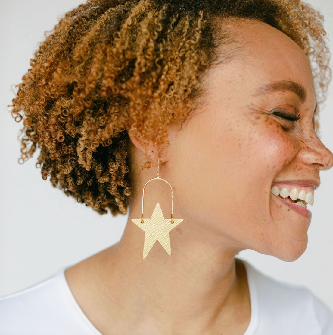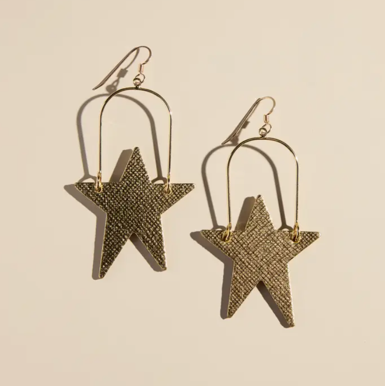 These gold start earrings are have been a consistent best seller. This lightweight, flexible leather features a shimmering metallic finish with a timeless saffiano cross-hatch pattern. From hook to the tip of the star, these earrings measure 3" and have a good balance of motion.