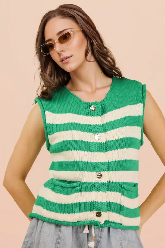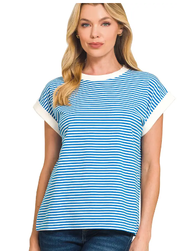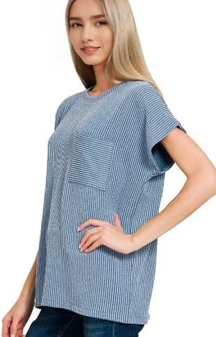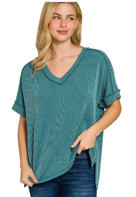 Corded Rib Short Cuff Sleeve Raw Edge Top