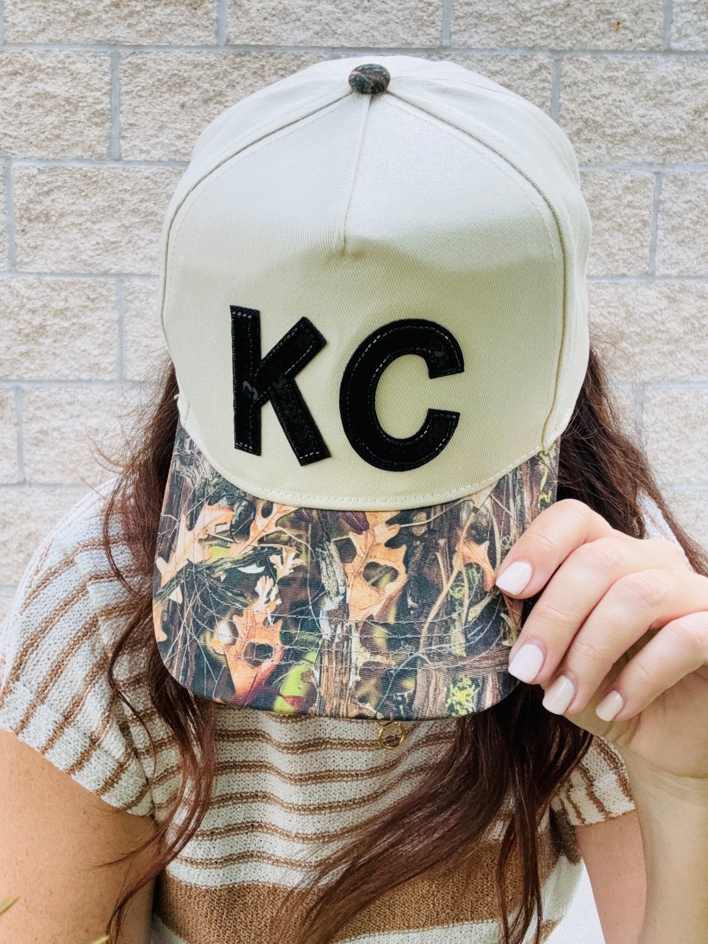 Add a touch of sparkle to your wardrobe with our KC Sequin Camo Trucker Hat. Featuring a black sequined KC logo on an ivory trucker hat with camo bill, this hat is sure to make a statement. Stand out from the crowd while showing off your love for KC.