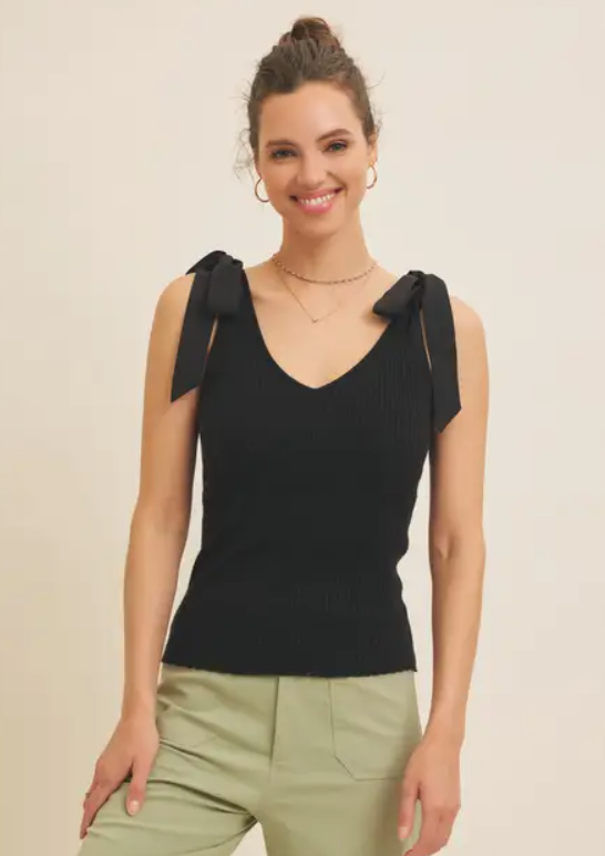 Mixed Media Shoulder Tie Stretchy Rib Sweater Top