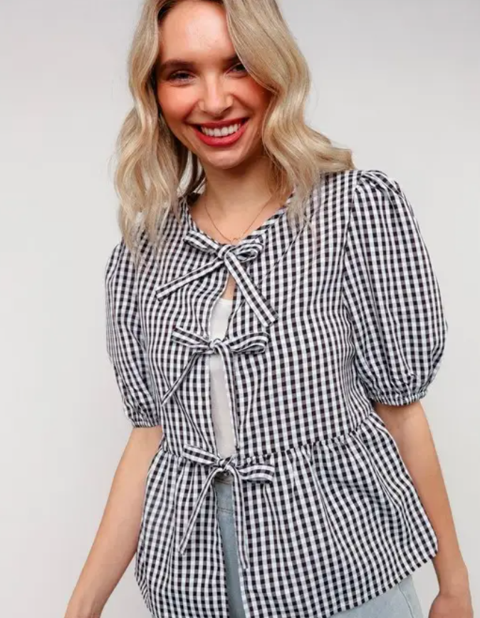 Ribbon Babydoll Gingham Check Short Sleeve Top