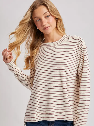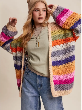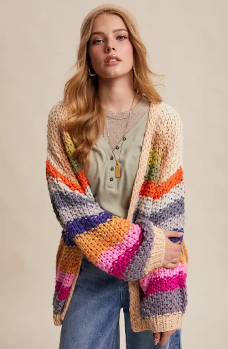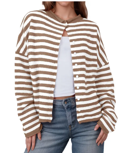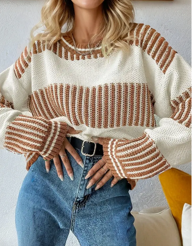 Brown Two Tone Striped Patchwork Drop Shoulder Loose Sweater