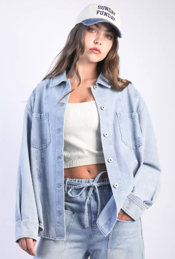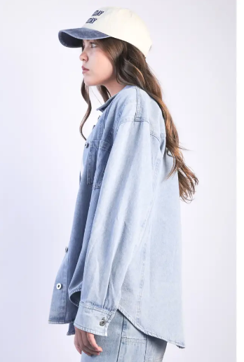 Embroidery Babydoll Denim Blouse Top with Round Split Neck