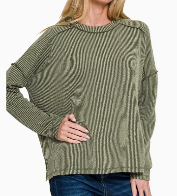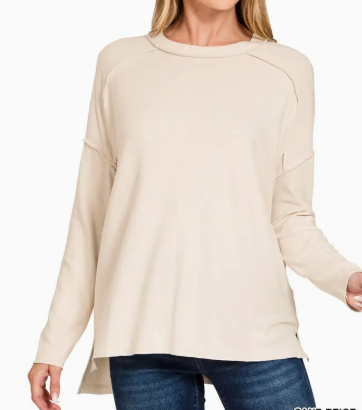 Corded Rib Raw Edge Long Sleeve Top