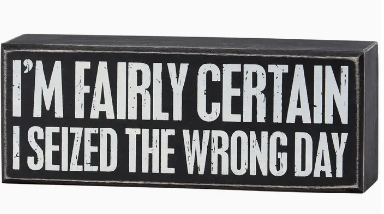 A classic black and white wooden box sign from our Box Sign Collection displaying a humorous sentiment that reads "I'm Fairly Certain I Seized The Wrong Day." Funny box sign features distressed details with coordinating black color on sides and back. Our I Seized The Wrong Day box sign is easy to hang or can free-stand alone. A funny gift that can be easily displayed in any home or work space.