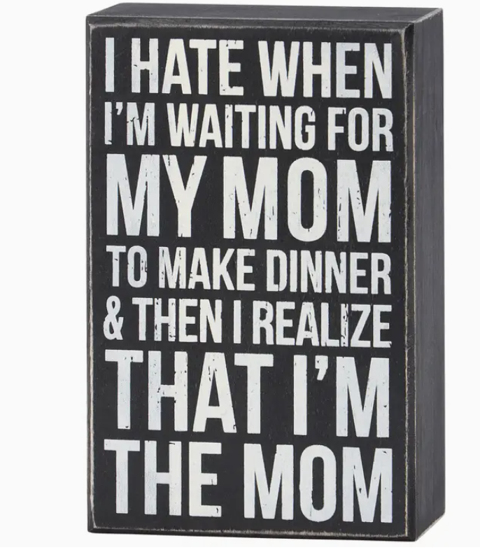 A classic black and white wooden box sign from our Mother's Day Collection displaying a fun mom-themed sentiment that reads "I Hate When I'm Waiting For My Mom To Make Dinner & Then I Realize That I'm The Mom." Funny mom box sign features distressed details with coordinating black color on sides and back. Our I'm The Mom box sign is easy to hang or can free-stand alone. A fun Mother's Day gift that can be easily displayed in any home or work space.