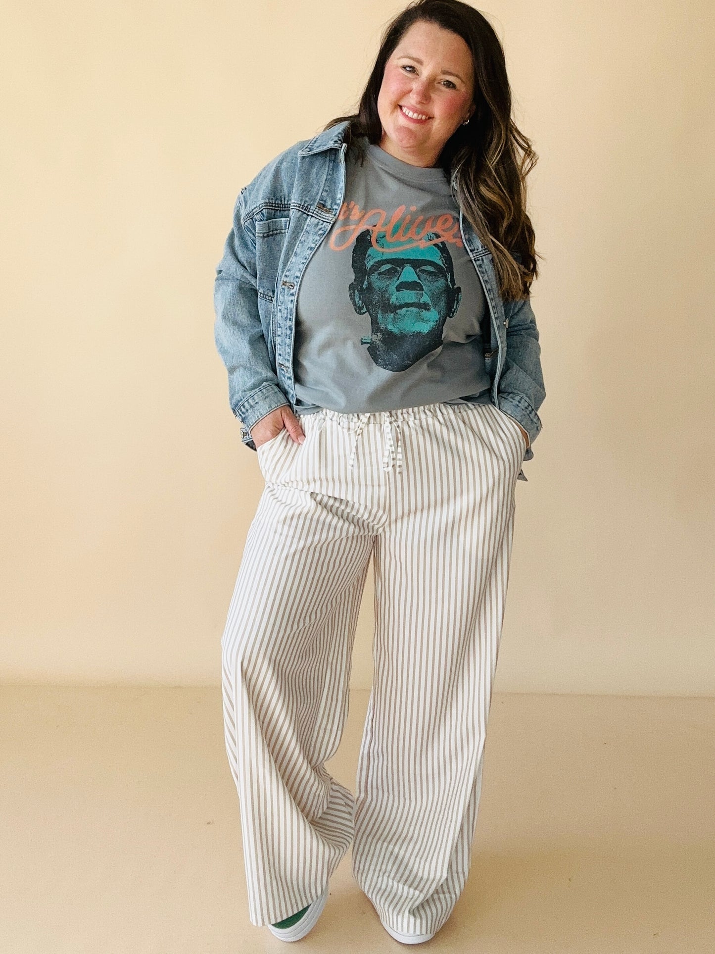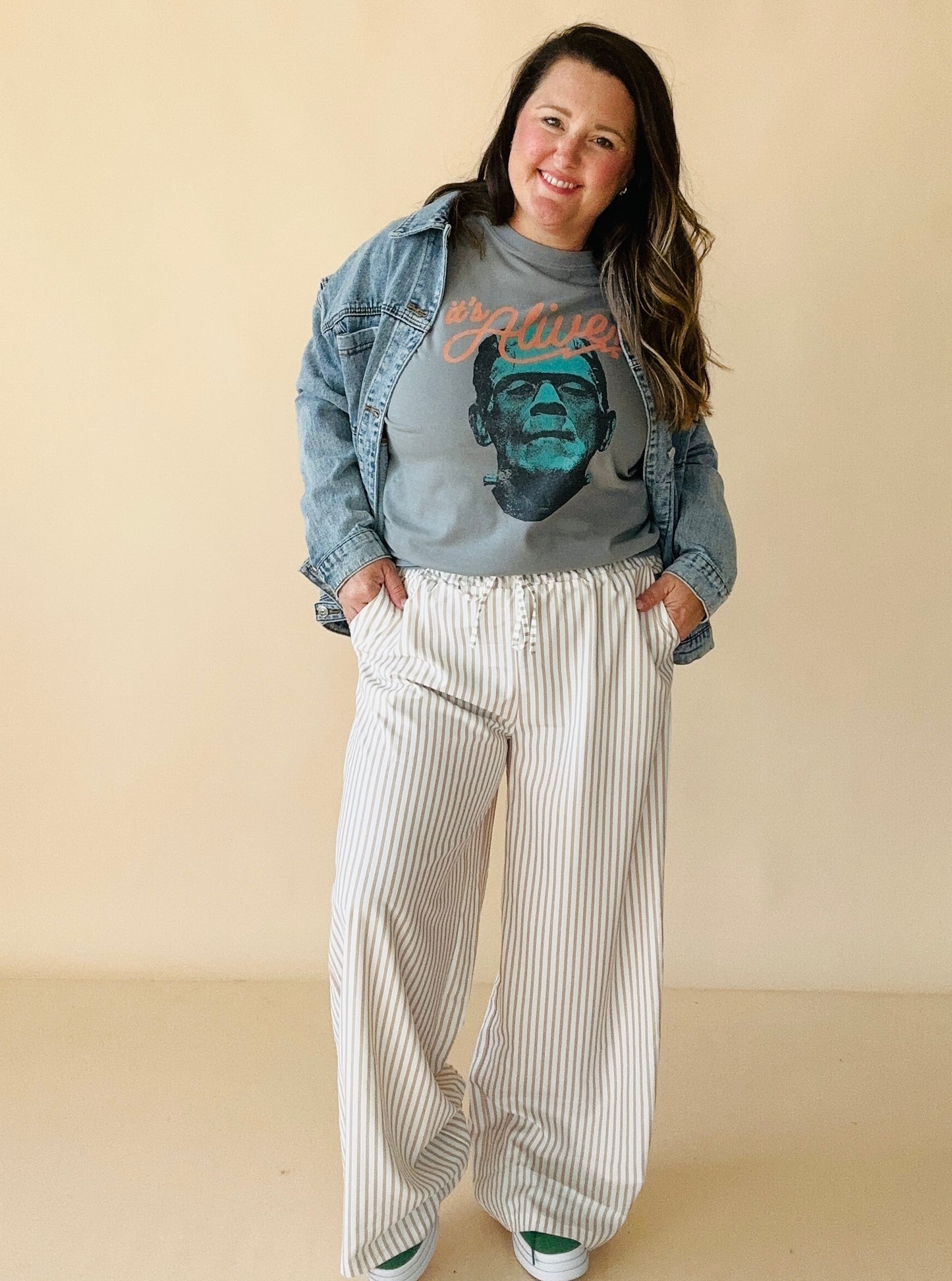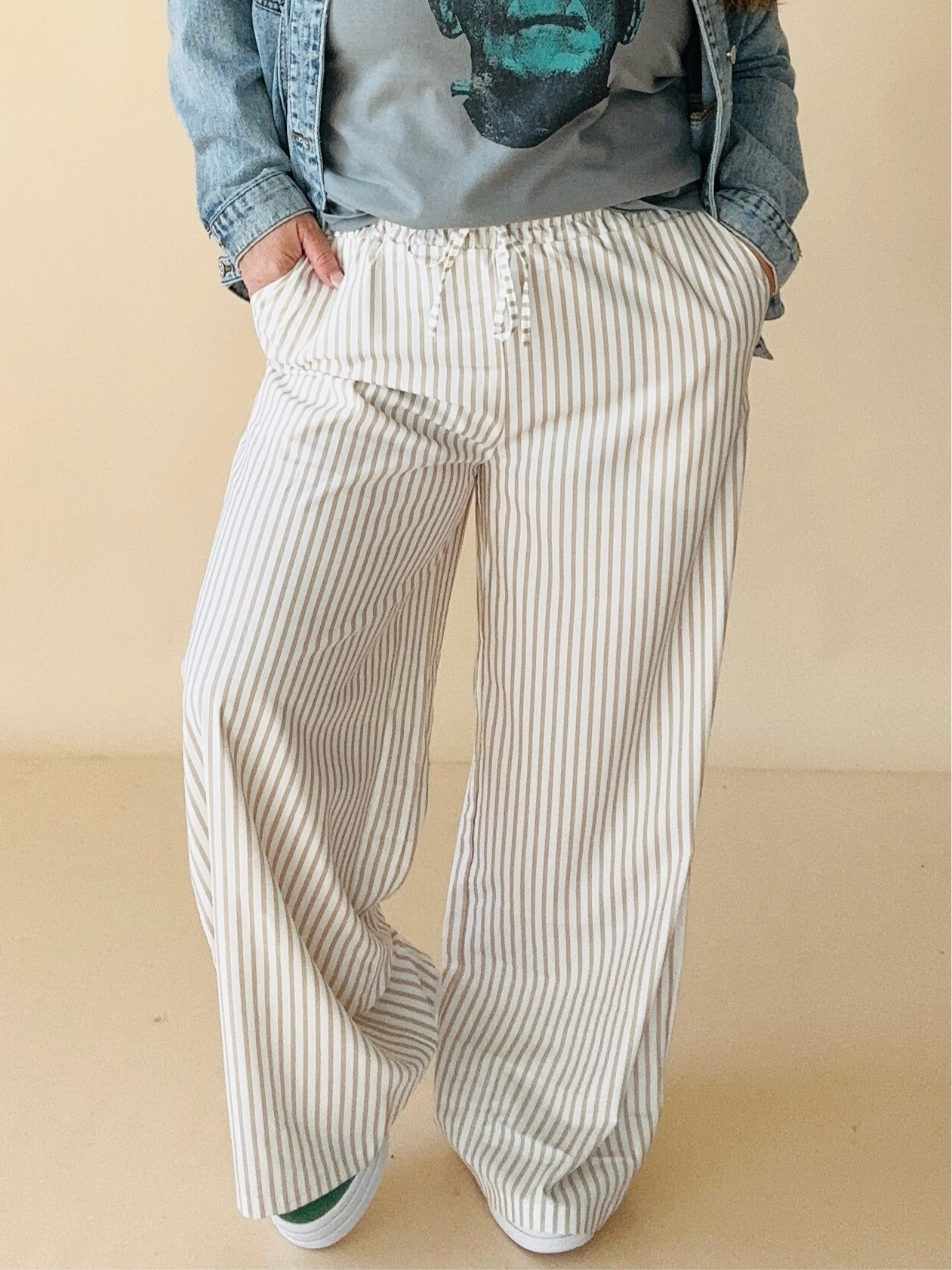 These Stripe Print Wide Leg Drawstring Pants are the perfect mix of playful and comfortable. With a flowy wide leg silhouette and adjustable drawstring waist, these striped pants offer both style and practicality. Elevate your wardrobe with these statement pants.